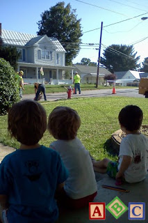 This morning city works came over to fix the leaking water main in the front of our house. We spent over 3 hours watching them cut through the street, dig a giant hole, and replace the broken pipes. It was quite exciting!